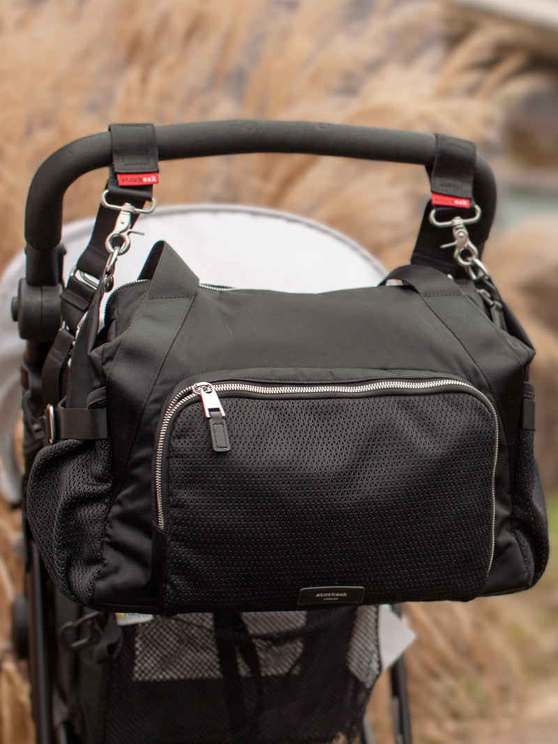 Our changing bags and accessories either include or are compatible with stroller clips or straps. You can usually find them as separate clips inside your changing bag, built-in to your long detachable strap or on the backpack straps. This handy feature is perfect for attaching your Storksak easily to your stroller.
