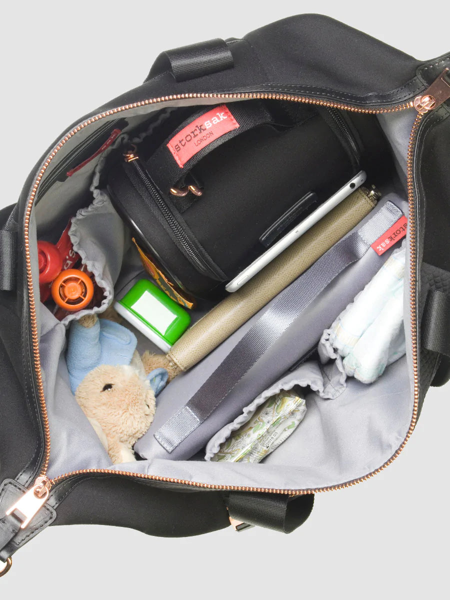 Our changing bags come already equipped with unrivalled accessories including: a generously sized changing mat with pockets to keep nappies and wipes close to hand, an insulated bottle holder/ snack bag made in the same tough and hardwearing material as your bag; perfect for bottle feeding and beyond, plus a cross body strap with built-in stroller clips, finished in the same hardware colour to match your bag.
